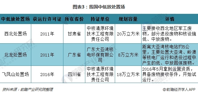 另外,以每年每臺核電機組產生60立方米固體廢物包計算,預計2020年我國每年將產生多達3480立方米的固體廢物。然而,我國目前僅有中低放核廢料處置場3座,分別為西北處置場、北龍處置場以及飛鳳山處置場,其規劃容量分別20萬立方米、8萬立方米以及18萬立方米。因此,我國中低放處理能力十分緊缺,按照國務院印發的“十三五”生態環境保護規劃,提出要建設5座中低放射性廢物處置場。